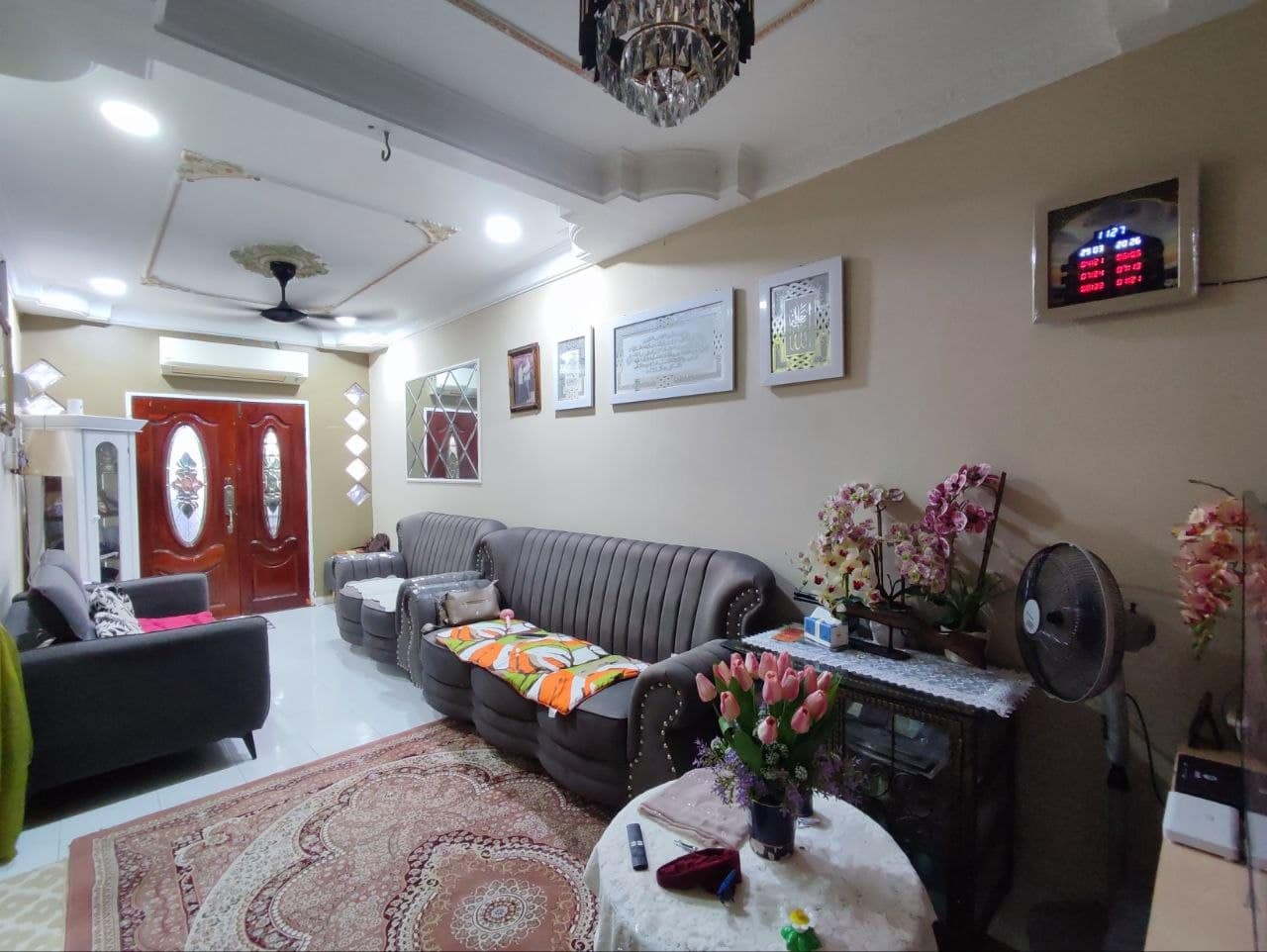 Plaster Ceiling: Pemasangan plaster ceiling di seluruh ruang memberikan sentuhan moden dan menjadikan suasana di dalam rumah lebih sejuk dan elegan.